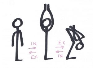 Position de départ debout bras le long du corps, lever les bras au dessus de la tête en inspirant, s’incliner vers l’avant en expirant, le front en direction des genoux, placer les bras dans le dos, faire une pause ou une respiration là, remonter en inspirant, en relevant le dos, les bras et la tête, enfin abaisser les bras le long du corps en expirant. Recommencer 3 à 6 fois la même séquence.